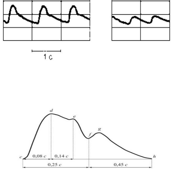 На рис. 7 представлен типичный цикл сфигмограммы. Точкам c и h этой кривой соответствует диастолическое давление в артерии; точке d – систолическое. С помощью этого графика рассмотрим особенности функционирования кровеносных сосудов при сердечном сокращении и стадии формирования пульсовой волны.