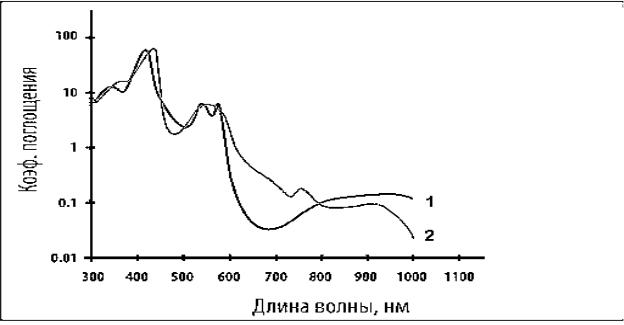 На рис.1 представлены спектры поглощения гемоглобина в двух его состояниях: