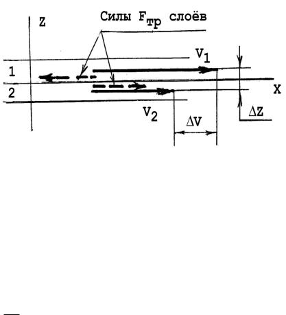 Если в двух параллельных соприкасающихся слоях жидкость движется с различной скоростью v1 и v2, то по границе их соприкосновения действуют силы вязкого трения (рис. 1):