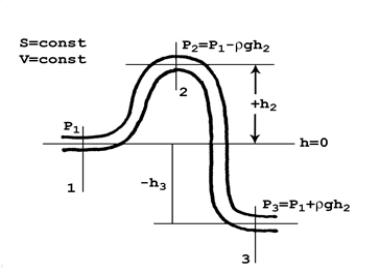 Мы убедились, что статическое давление в приподнятых участках меньше, чем давление p1 на входе, а на опущенных – оно, наоборот, превосходит входное.