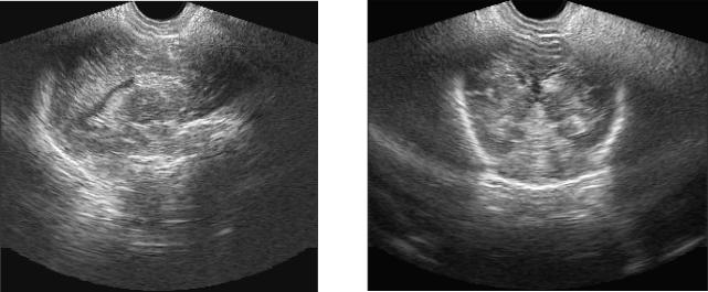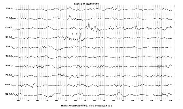 Рис. 12. Постменструальный возраст 37 недель. ПИВК II ст. и сопутствующая ПВЛ (кистозная стадия). На ЭЭГ в центральных отделах регистрируются «позитивные острые волны».