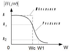В практическом случае полосы пропускания и задерживания четко не разграничены и должны быть формально определены. Исходя из нашего определения, в качестве полосы пропускания выбирается диапазон частот, где значение амплитудно-частотной характеристики превышает некоторое заранее выбранное число, обозначенное A1 на рис. 2, а полосу задерживания образует диапазон частот, в котором амплитудно-частотная характеристика меньше определенного значения, например, A2 . Интервал частот, в котором амплитудно-частотная характеристика постоянно спадает, переходя от полосы пропускания к полосе задерживания, называется переходной областью. Приведенный на рис. 2 пример имеет полосу пропускания 0<w<wc, полосу задерживания w>w1 и переходную область wc<w<w1.