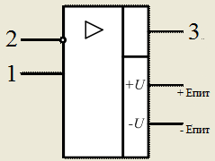 Операционный усилитель представляет собой многовходовый прибор, но для простоты показаны только три его вывода: инвертирующий входной (1), неинвертирующий входной (2) и выходной (3). В идеальном случае ОУ обладает бесконечным входным и нулевым выходным сопротивлениями и бесконечным коэффициентом усиления. Вследствие этого можно, при исследованиях рассматривать только напряжение между входными выводами, а также считать, что ток во входных выводах равен нулю. Реальные ОУ по своим характеристикам приближаются к идеальным наиболее близко только для ограниченного диапазона частот, который зависит от типа ОУ.