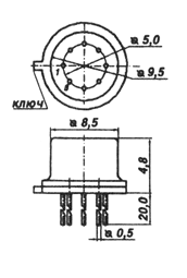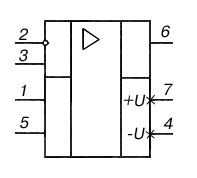 Назначение выводов: 1,5,8 - коррекция; 2 - вход инвертирующий; 3 - вход неинвертирующий; 4 - напряжение питания -Uп; 6 - выход; 7 - напряжение питания +Uп; |