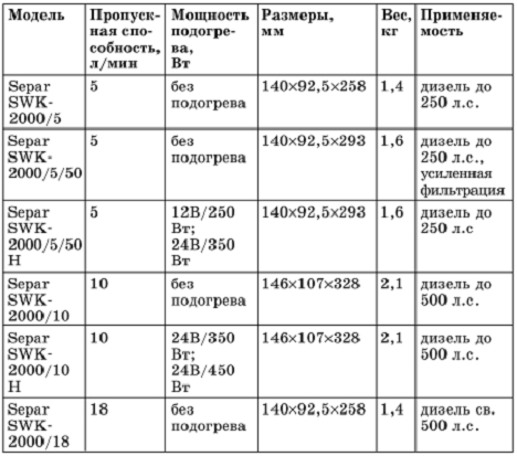 Изготовителем предусмотрен широкий ряд фильтров Separ с пропускной способностью до 260 л/мин, которые могут быть установлены на двигатели с мощностью до 10 000 кВт, в том числе на суда и АЗС. Выпускается модификации с подогревом топлива. Фильтры могут быть оборудованы дополнительным датчиком контроля уровня воды в отстойнике, что позволяет водителю иметь дистанционный контроль. Расположенный внутри отстойника нагревательный элемент эффективно подогревает поток топлива, растапливая выделяющийся парафин. Тем самым удается избежать забивания им фильтра. Управление подогревом осуществляется автоматически термостатом, включающим подогрев при температуре ниже +5 °C и выключающем его при температуре около +10 °C. В фильтре предусмотрена аварийная термозащита, тепловой предохранитель которой отключает подогрев при превышении температуры более +80 °C.