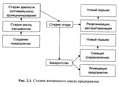 Предприятие, как субъект хозяйствования, в процессе функционирования проходит ряд стадий: создание, рост, зрелость, спад, реорганизация (реструктуризация) или санация, банкротство, ликвидация (рис. 1).