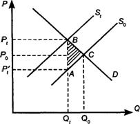 Потребители снижают объем покупок. Обратите внимание, что рыночная цена растет не на Рt - Р’t, а лишь на Рt - Р0. Таким образом, часть нового налога (Рt - Р0) ложится на покупателя, а другая часть - на продавца (Рt - Р’t). Треугольник АВС составит чистую потерю для всех участников. Это потеря от сокращения объема операций и, следовательно, сокращения выигрыша для всех.