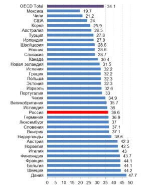 В настоящее время средние по странам ОЭСР показатели налоговой нагрузки доступны только за 2011 год. Налоговая нагрузка в России в 2011 г. была выше средних показателей ОЭСР и сравнима с налоговой нагрузкой ряда стран Западной и Центральной Европы (Чехией, Германией, Исландией, Словенией, Великобританией). В некоторых развитых европейских странах, в особенности, в скандинавских, налоговая нагрузка заметно выше, чем в России. В странах Восточной и Южной Европы (Польше, Испании, Португалии) она ниже, и наконец, в странах «тихоокеанского» региона и странах ОЭСР она заметно ниже. В последнюю группу стран входят как развитые страны (США, Австралия, Канада), так и развивающиеся страны (Мексика, Чили, Турция). Например, в Турции налоговая нагрузка почти на 10 п.п. ниже, чем в России, в Мексике - практически в два раза.