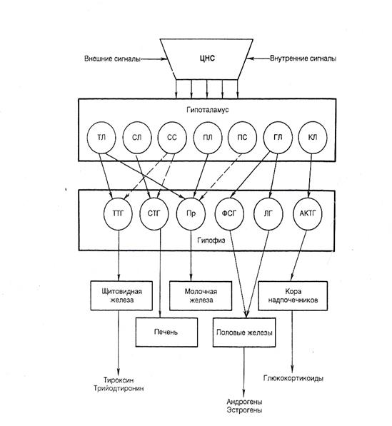 ТЛ – тиреолиберин; СЛ – соматолиберин; СС – соматостатин; ПЛ – пролактолиберин; ПС – пролактостатин; ГЛ – гонадолиберин; КЛ – кортиколиберин. Сплошными стрелками обозначено активирующее, пунктирными – ингибирующее влияние.