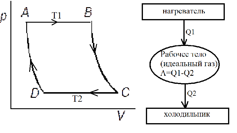Машина работает обратимо под цепью из 2 изотерм AB и CD, Т1=const, и 2 адиабат BC и DA. На участке AB рабочее тело изотермически при Т=Т1, претерпевая циклические изменения, рабочее тело возвращается в исходное состояние, при этом совершает работу А=Q1-Q2.