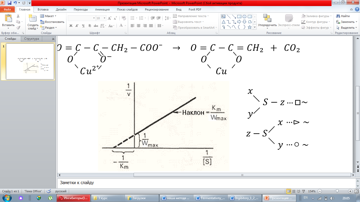Стационарная кинетика системы фермент-субстрат - конкурентный ингибитор (Y) описывается уравнением:
