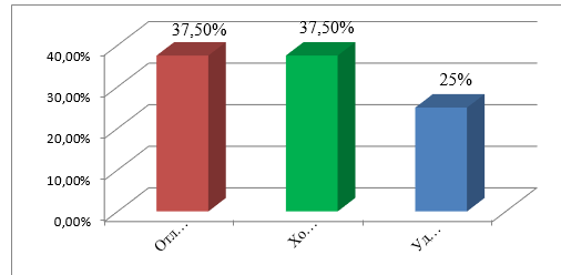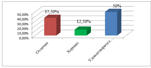 В соответствии с рисунком 3 видно, что в тесте «Поднимание туловища из положения лежа на спине за 30 сек» только 12,5% справились на «отлично», 37,5% выполнили тест на «хорошо» и 50% испытуемых справились на «удовлетворительно».