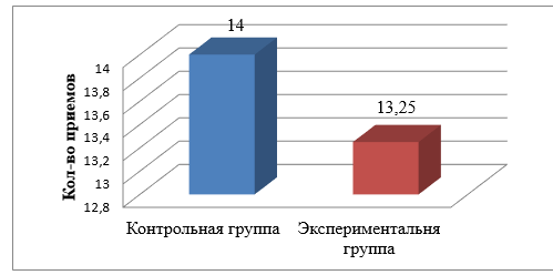 В соответствии с рисунком 5, среднее количество применяемых приемов практически одинаково, в контрольной группе средний показатель составил 14 приемов за схватку, а в экспериментальной группе данный показатель составил 13,25 приемов.