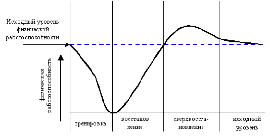 Из графика видно, что, приступая к тренировкам, работоспособность человека находится на каком-то определенном начальном уровне. В процессе тренировки наступает утомление организма и как следствие снижается работоспособность. После прекращения тренировки наступает этап восстановления и, что очень важно, физическая работоспособность и многие определяющие ее функции организма на протяжении периода восстановления после интенсивной тренировки не только достигают предрабочего уровня, но могут и превышать его, проходя через фазу перевосстановления. Спустя некоторое время, повышенная работоспособность возвращается на исходный уровень.