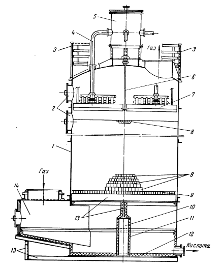 - стальная обечайка; 2 - люки; 3 - ограждение на крышке; 4 - труба для подачи кис-лоты; 5 - напорный бачок; 6 - тяга для подвески плит; 7 - плита стальная со стаканчиками для распределения кислоты; 8 - насадка (снизу по дна ряда колец 150x150, 120X120, 100х100, 80X80 мм, сверху 143 ряда колец 50x50 мм); 9 - колосниковая решетка; 10 - стойка (стальная труба); 11 - стальная сетка с кислотоупорной обмазкой: 12 - днище (кислотоупорный кирпич); 13 - опорные балки; 14 - газовая коробка.