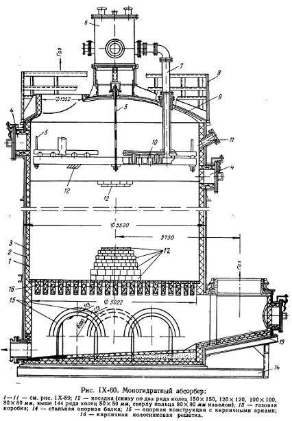 - стальная обечайка: 2 - кислотоупорный кирпич; 3 - асбест; 4 - люки; 5 - тяги для подвески плиты; 6 - напорный бачок; 7 - труба для подачи кислоты; 8 - ограждение на крышке; 9 - крышка; 10 - распределитель кислоты по плите; 11 - смотровое окно; 12 - насадка (снизу по два ряда колец 150 X 150. 120х 120. 100x100 80X 80мм, выше 144 ряда колец 60X 50 мм, сверху кольца 80Х80 мм навалом); 13 - газовая коробка; 14 - стальная опорная балка; 15- опорная конструкция с кирпичными арками;16 - кирпичная колосниковая решетка.