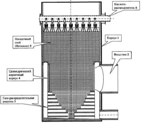 Газовая смесь или воздух поступает через входной тангенциально выполненный патрубок (2) в кольцевое пространство между корпусом (1) и внутренним, выложенным из кислотоупорного кирпича, цилиндрическим корпусом (4) на газораспределительной решетке (3), распределяется по всему периметру кольцевого пространства и равномерно поступает через газовые каналы газораспределительной решетки на насадку абсорбционной башни (5), на которой происходят теплообменные и массообменные процессы. Насадка орошается концентрированной серной кислотой через кислотораспределительные устройства (6)[12]