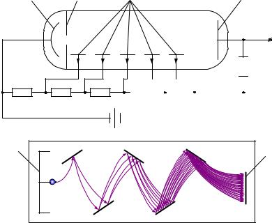 Схематическое устройство этого прибора показано на рис. 6.7. Обычно это стеклянная колба, в торце которой устанавливается полупрозрачный фотокатод 1, за которым устанавливается фокусирующая диафрагма 2 и несколько вторичных катодов 3, которые иногда называются еще динодами, за которыми располагается анод 4. Каждый из этих электродов подключается к различным точкам делителя напряжения, подающего на эти электроды различные потенциалы. Слабый световой