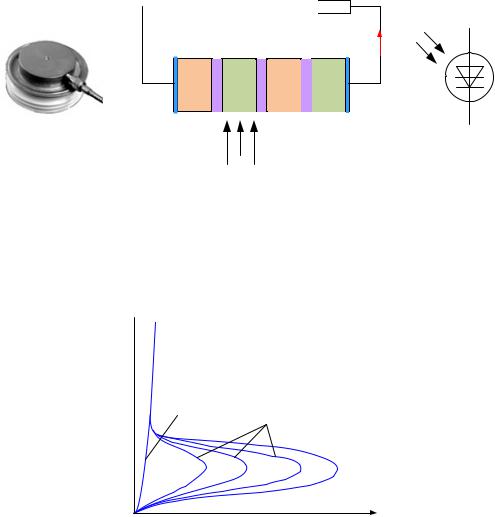 Вместо управляющего электрода сигнал управления в виде потока лучистой энергии (рис. 6.24) подается в специальное окно в корпусе прибора, что приводит к тем же явлениям, как если бы был подан электрический сигнал управления на управляющий электрод. Все остальные характеристики такого тиристора аналогичны характеристикам обычного тиристора с электрическим управлением.