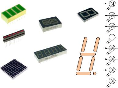 Рис. 6.29. Знакосинтезирующие индикаторы: линейные шкалы (а), светодиодная матрица (б), цифровые индикаторы (в, г, д)