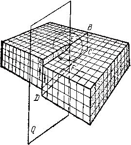 Винтовая дислокация получена при помощи частичного сдвига по плоскости Q вокруг линии EF (рис.13.) На поверхности кристалла образуется ступенька, проходящая от точки Е до края кристалла. Такой частичный сдвиг нарушает параллельность атомных слоев, кристалл превращается в одну атомную плоскость, закрученную по винту в виде полого геликоида вокруг линии EF, которая представляет границу, отделяющую часть плоскости скольжения, где сдвиг уже произошел, от части, где сдвиг не начинался. Вдоль линии EF наблюдается макроскопический характер области несовершенства, в других направлениях ее размеры составляют несколько периодов.