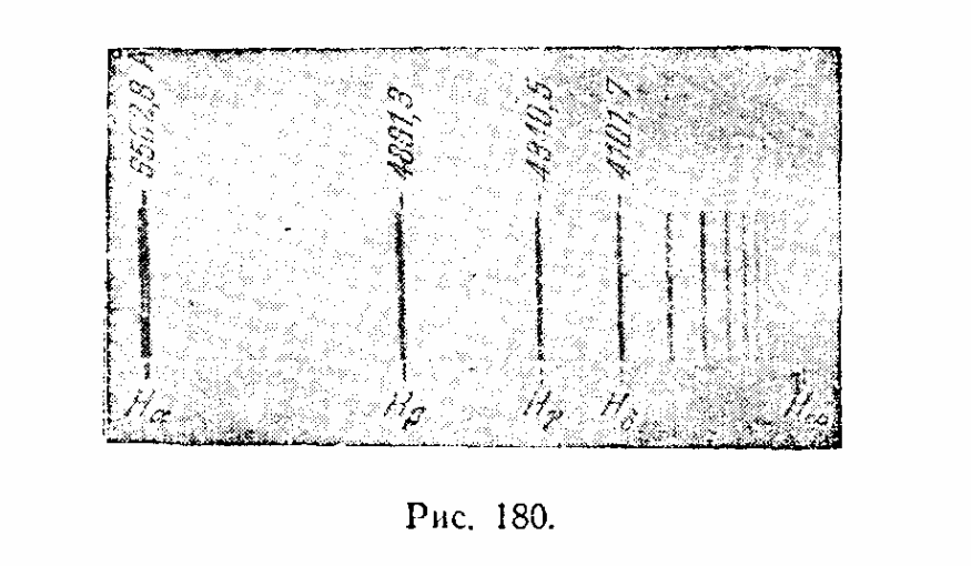 Рис.1: Часть спектра атомарного водорода в видимой УФ-области. Линии располагаются в определенном порядке. Расстояние между линиями закономерно убывает по мере перехода от более длинных волн к более коротким.