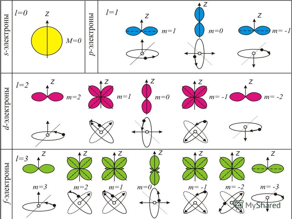 Орбитали с l = 0 называются s-орбиталями, l =1 - р-орбиталями (3 типа, отличающихся магнитным квантовым числом m), l = 2 - d-орбиталями (5 типов), l = 3 - f-орбиталями (7 типов).