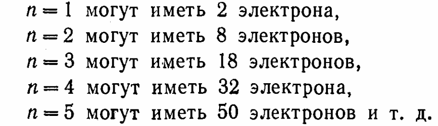 Спиновое число может принимать только 2 значения, поэтому в состояниях с данным значением n могут находиться в атоме не более 2n2 электронов:
