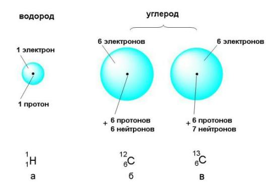 Массы субатомных частиц чрезвычайно малы. Показатель степени (например, десять в минус двадцать седьмой степени) показывает, сколько нулей после запятой нужно записать, чтобы получилась десятичная дробь, выражающая массу субатомной частицы в килограммах. Это ничтожнейшая часть килограмма, поэтому массу субатомных частиц удобнее выражать в атомных единицах массы (сокращенно – а.е.м.). За атомную единицу массы принята ровно 1/12 часть массы атома углерода, в ядре которого содержится 6 протонов и 6 нейтронов. Схематическое изображение такого "эталонного" атома углерода приведено на рис. 2-5 (б). Атомную единицу массы можно выразить и в граммах: 1 а.е.м. = 1,660540·10-24 г.