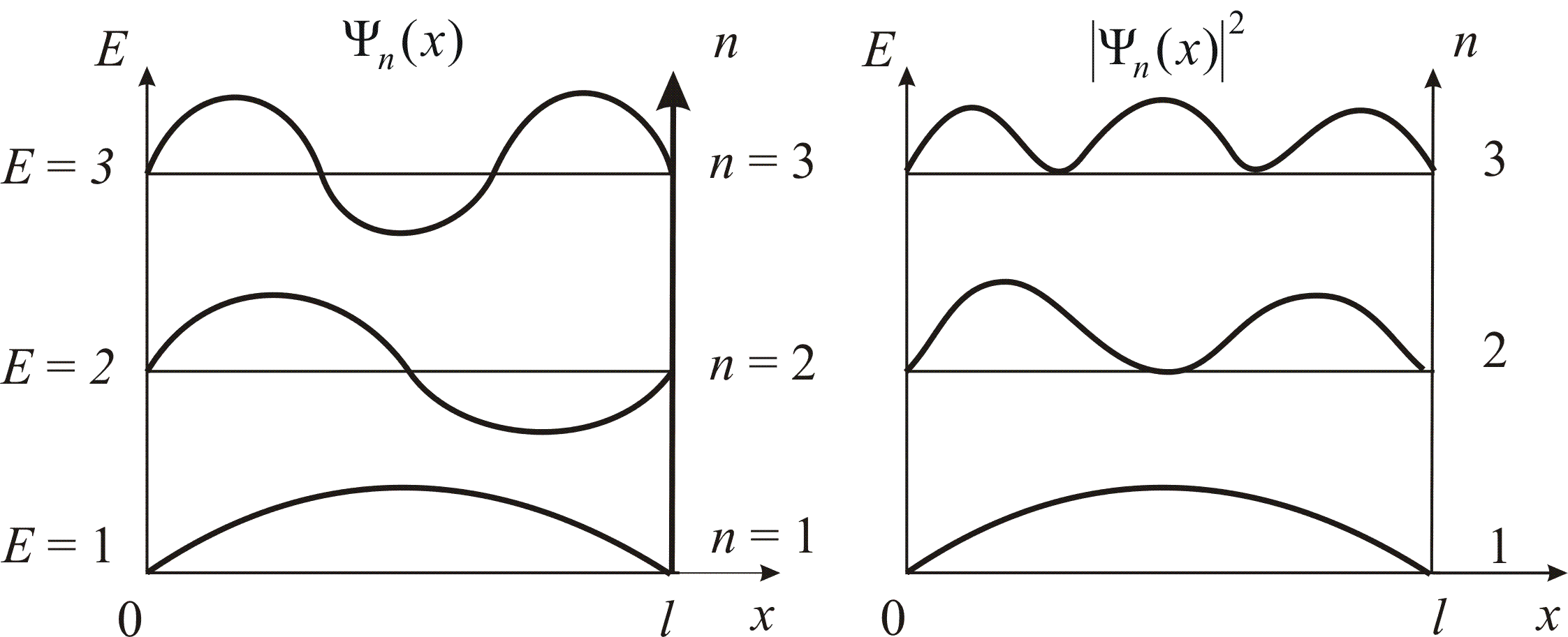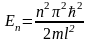 Т.е. стационарное уравнение Шредингера описывающее движение частицы в потенциальной яме с бесконечно высокими стенками, удовлетворяется только при собственных значениях En, зависящих от целого числа n. Следовательно, энергия En частицы в потенциальной яме с бесконечно высокими стенками принимает лишь определенные дискретные значения, т.е. квантуется. Квантовые значения энергии En называется уровнями энергии, а число n, определяющее энергетические уровни — главным квантовым числом.