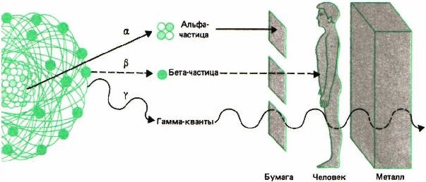 Эти три вида радиоактивных излучений сильно отличаются друг от друга по способности ионизировать атомы вещества и, следовательно, по проникающей способности. Наименьшей проникающей способностью обладает α-излучение. В воздухе при нормальных условиях α-лучи проходят путь в несколько сантиметров. β-лучи гораздо меньше поглощаются веществом. Они способны пройти через слой алюминия толщиной в несколько миллиметров. Наибольшей проникающей способностью обладают γ-лучи, способные проходить через слой свинца толщиной 5–10 см.