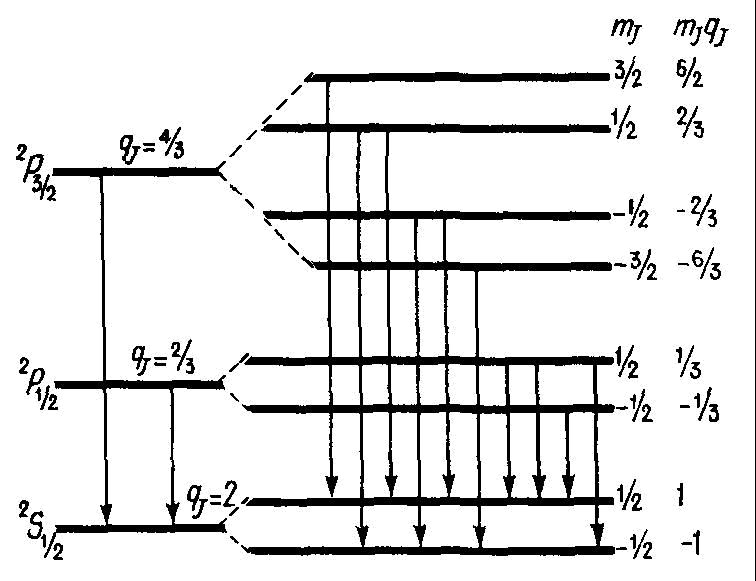 Энергетический уровень 2Р3/2 с полным моментом J = 3/2 расщепляется на четыре подуровня, соответствующие четырем возможным ориентациям полного момента относительно магнитного поля (mJ = -3/2, -1/2, 1/2, 3/2). Энергетические уровни 2P1/2 и 2S1/2 с полным моментом J =1/2 расщепляются на два подуровня каждый, которые соответствуют двум возможным ориентациям полного магнитного момента относительно индукции магнитного поля (mJ = -1/2, 1/2).