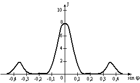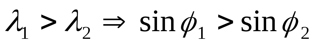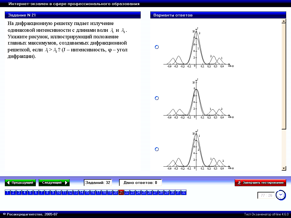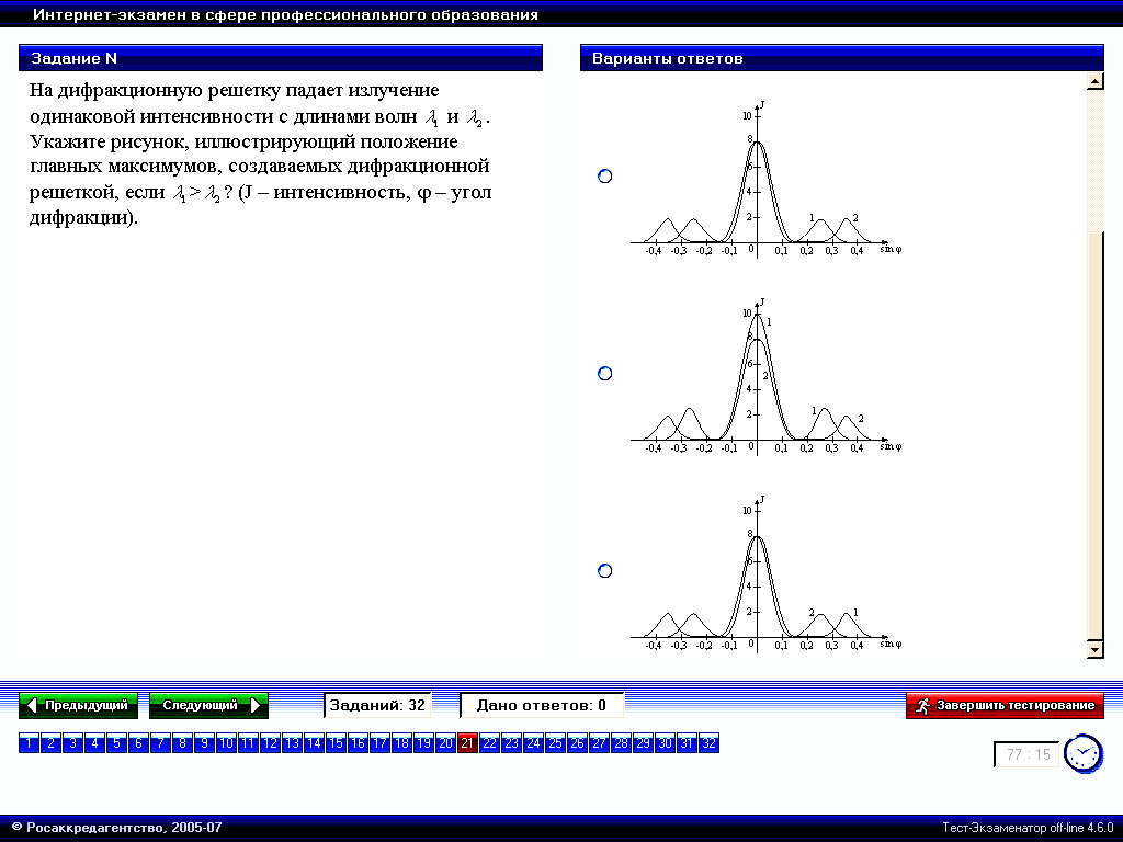 Одна и та же дифракционная решетка освещается различными монохроматическими излучениями с разными интенсивностями. Какой рисунок соответствует случаю освещения светом с наибольшей частотой? (J – интенсивность света, φ – угол дифракции). |
