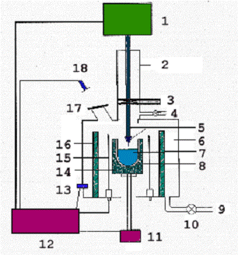 блок управления, состоящий из микропроцессора, датчиков температуры и диаметра растущего слитка (13, 19) и устройств ввода;