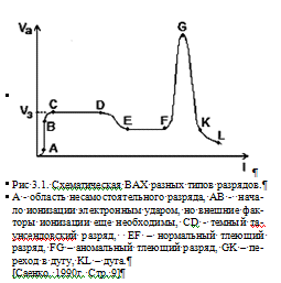 Разряд, который существует без внешних ионизаторов, называется самостоятельным. Началу ионизации электронным ударом соответствует участок кривой BC. (Рис. 3.1.) При этом внешние факторы ионизации еще необходимы. С прекращением их действия прохождение тока также прекращается и разряд обрывается. В точке С напряжение достигает пробивного значения V3,(потенциал зажигания) ток скачкообразно возрастает на несколько порядков, пока не ограничится разрядным сопротивлением. На участке CD разряд характеризуется настолько слабыми возбуждением и ионизацией, что свечение и пространственный заряд практически отсутствуют, условия прохождения тока соответствуют простейшей теории лавин ионизации Таунсенда, поэтому эта форма разряда называется темновым, или таунсендовским, разрядом [Cаенко, стр. 11]. Такой самостоятельный разряд действительно наблюдается на опыте, в обычных трубках - при токах i~10-10-10-5 А. Из-за чрезвычайной малости газ совсем не светится. Ток регистрируют высокочувствительными приборами. [Райзер, 1987, с. 261]
