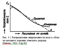 b) Предположение о движении заряженных частиц в области катодного падения. Скорость положительных ионов может быть вычислена из подвижности и напряженности поля. Но это годится только для достаточно обширных областей с однородной напряженностью поля. В действительности же скорость переноса меньше, если пройденные ранее напряженности поля были меньше, чем рассматриваемые в данный момент, и наоборот. Так как положительные ионы движутся к катоду через области с возрастающей напряженности поля, то их действительная скорость меньше, чем предположенная. Образованные ионизацией положительные ионы будут, таким образом, медленнее удаляться из области катодного падения к катоду и создадут пространственный заряд большей плотности. [Энгель, 1935, с. 85].