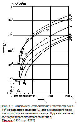Зависимость относительной плотности тока j/p2 от катодного падения Vк для аномального тлеющего
