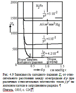 Какую роль играет темное катодное пространство для поддержания тлеющего разряда, показывают изменения катодного падения при сближении электродов. Исследуя эту зависимость, Гюнтершульце нашел, что при приближении анода к катоду, пока он находится в области катодного сияния, напряжение остается постоянным или даже в некоторых случаях уменьшается. Но на некотором расстоянии от оптической границы катодного сияния начинается возрастание напряжения. Это возрастание происходит очень круто при дальнейшем уменьшении расстояния. На рис. 4.8 приведены результаты измерений в азоте при разных давлениях (верхняя кривая при давлении 0,13 мм Hg, нижняя- при 0,63 мм). Изменение напряжения при уменьшении расстояния очень сходно как в случае нормальной, так и аномальной плотности тока и катодного падения. [Энгель, 1935, стр. 83]: Анод бомбардируется первичными электронами, обладающими еще значительной энергией, так как эти электроны уже не могут теперь полностью отдать свою энергию в объеме газа. Таким образом только часть энергии, воспринятой первичными электронами, тратится на ионизацию и возбуждение, остальная часть превращается в тепло при входе первичных электронов в анод. Следовательно, если бы поле перед катодом оставалось постоянным, то первичные электроны могли бы образовать в газовом пространстве меньше ионов, чем при далеко отстоящем аноде. Тогда на катод не поступало бы то количество ионов, которые необходимы для поддержания стационарного тлеющего разряда. Для того чтобы при подобном малом расстоянии между электродами сохранялся такой «затрудненный разряд», в ионизации должны принять участие также вторичные, третичные и так далее электроны. Затрудненный разряд может поэтому существовать только при значительно больших силах поля (также при большом γ), чем свободный разряд. Если при постоянной силе разрядного тока сблизить электроды больше, чем до определенного критического состояния, то напряжение на электродах должно сильно возрасти; нарастание напряжения тем больше, чем меньше расстояние между электродами (Рис. 4.9 ).