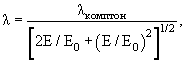 где E0 = mc2 − энергия покоя частицы массы m, λкомптон = h/mc − комптоновская длина волны частицы, λкомптон (электрон) = 2.4·10-12 м = 0.024 Å, λкомптон (протон) = 1.32·10-15 м = 1.32 фм. Длина волны де Бройля фотона с энергией Е определяется из соотношения