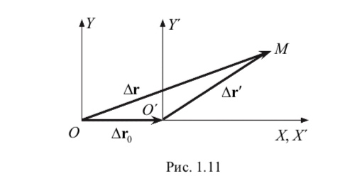 Пусть за промежуток времени Δt точка переместилась на Δr′ в системе отсчета X'O'Y', а сама система X'O'Y' переместилась относительно системы XOY на Δr0.