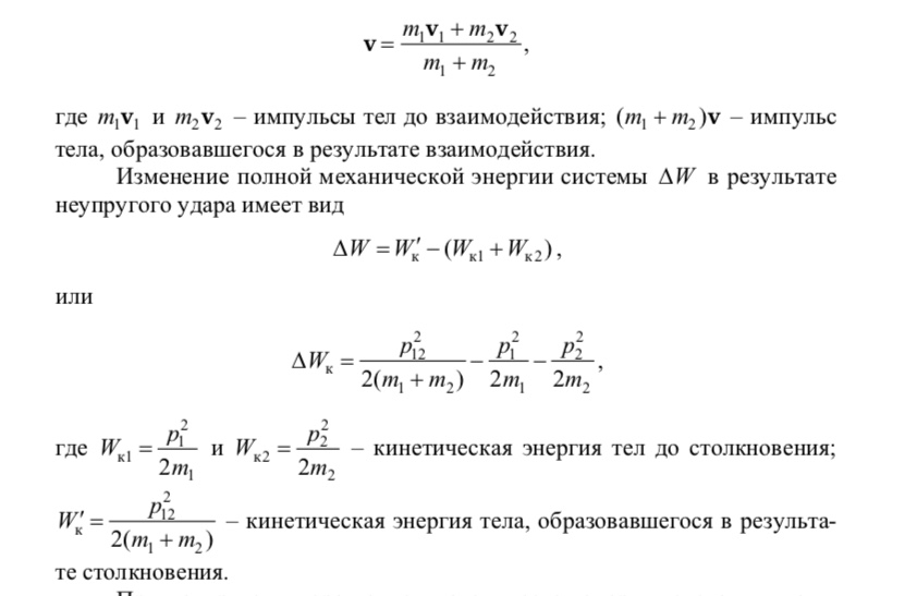При неупругом ударе полная механическая энергия системы уменьшается. Этот результат не противоречит закону сохранения и превращения энергии. Дело в том, что при абсолютно неупругом ударе происходит деформация соударяющихся тел. Эта деформация сохраняется и после соударения, поэтому она называется остаточной деформацией.