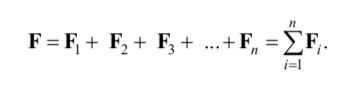 Если на тело действует несколько сил F1, F2, F3, ..., Fn одновременно, то их действие может быть заменено действием одной силы F, которая называется равнодействующей и равна их геометрической сумме: