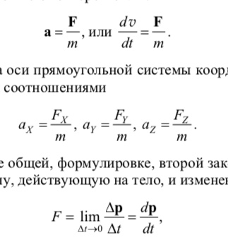 Второй закон Ньютона: ускорение a, приобретаемое материальной точкой в инерциальной системе отсчета, прямо пропорционально действующей на точку силе F, обратно пропорционально массе m точки и совпадает по направлению с вектором силы: