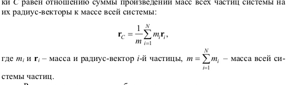 При поступательном движении системы материальных точек или тела их масса может считаться сосредоточенной в одной точке, которая называется центром масс, или центром инерции. Радиус-вектор такой точки С равен отношению суммы произведений масс всех частиц системы на их радиус-векторы к массе всей системы:
