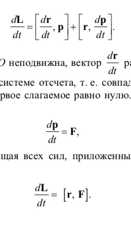 Итак, производная по времени от момента импульса L частицы относительно некоторой точки О выбранной системы отсчета равна моменту M равнодействующей силы F относительно той же точки О: