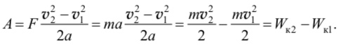 где v1 и v2 – модули векторов скоростей материальной точки или тела в начале и конце рассматриваемого перемещения r. Подставив выражение для r в формулу работы, получим