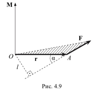 По определению векторного произведения вектор M перпендикулярен векторам r и F (т. е. заштрихованной на рис. 4.9 плоскости) и совпадает с направлением поступательного движения правого винта при вращении его от r к F.