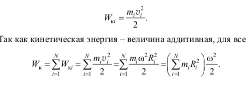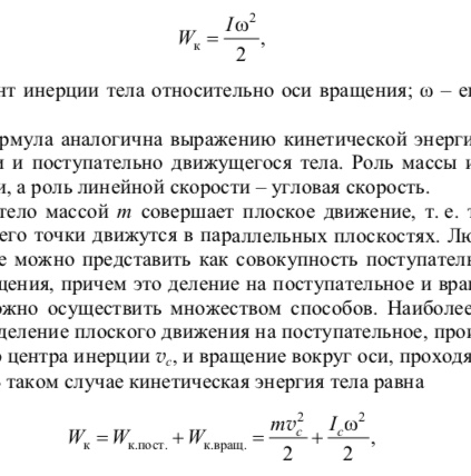 Эта формула аналогична выражению кинетической энергии материальной точки и поступательно движущегося тела. Роль массы играет момент инерции, а роль линейной скорости – угловая скорость.
