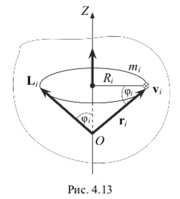Момент импульса i-й частицы относительно точки O, лежащей на оси вращения, по определению равен Li miri,vi, где ri – радиус-вектор, определяющий положение частицы массой mi относительно точки O; vi – скорость этой частицы (рис. 4.13). 58