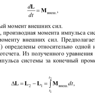 где Mвнеш. – функция от времени суммарного момента внешних сил, т. е. приращение момента импульса системы равно импульсу суммарного момента внешних сил за соответствующий промежуток времени.